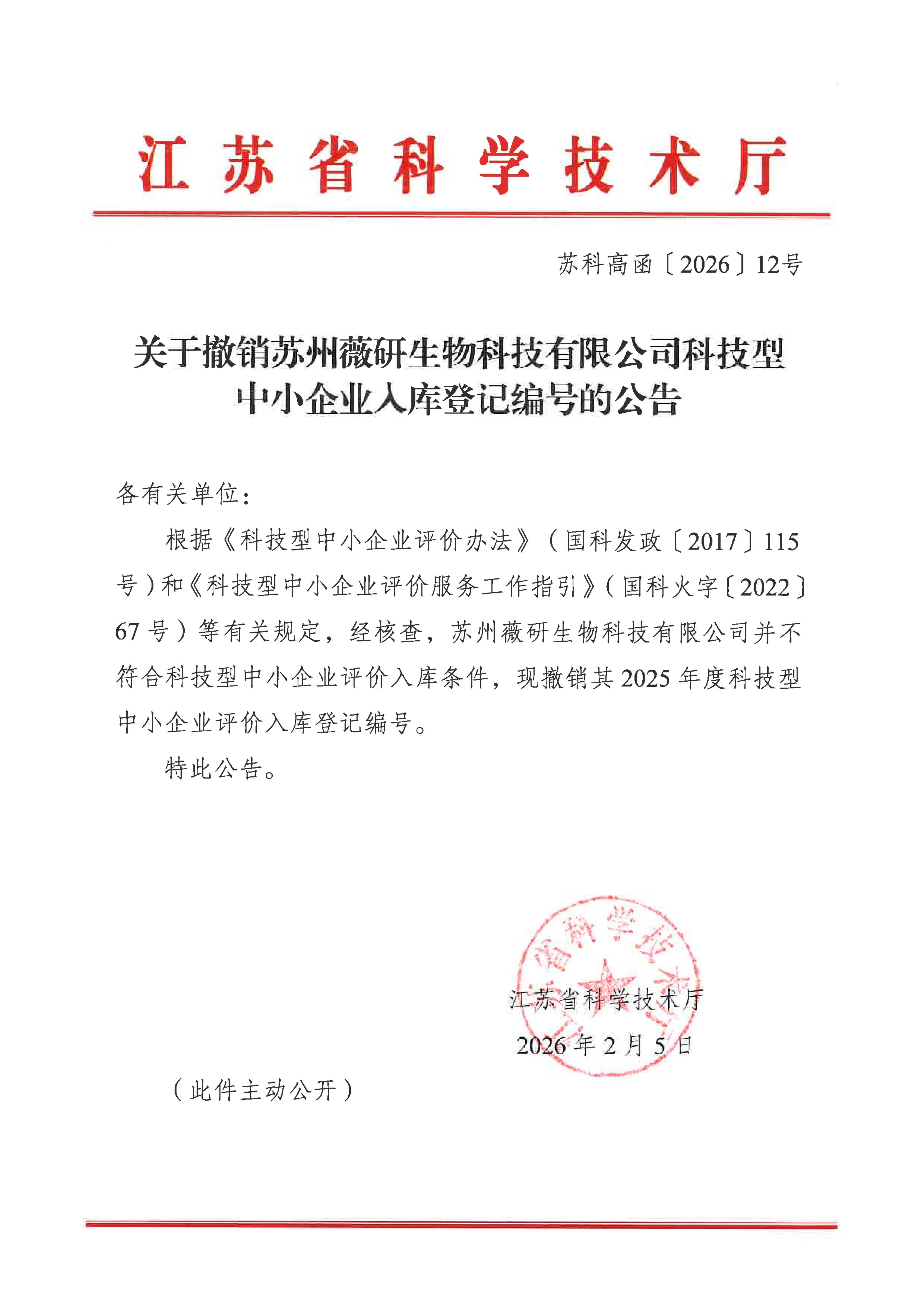 关于撤销苏州薇研生物科技有限公司科技型中小企业入库登记编号的公告.jpg PICTURE