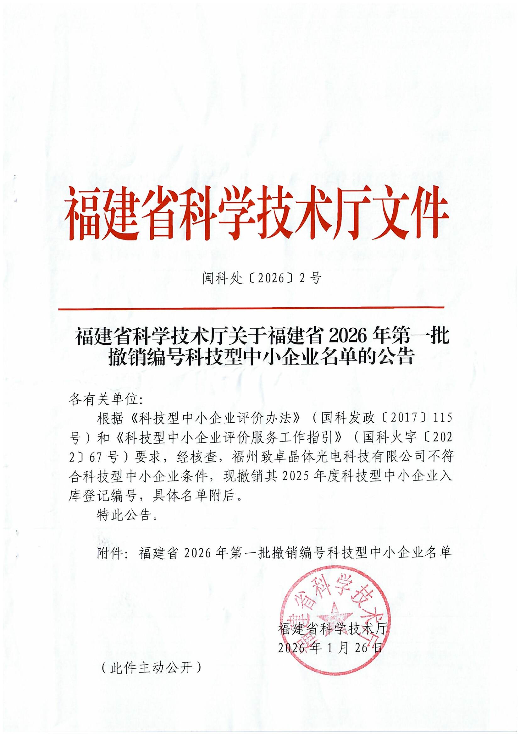 福建省科学技术厅关于福建省2026年第一批撤销编号科技型中小企业名单的公告.jpg PICTURE