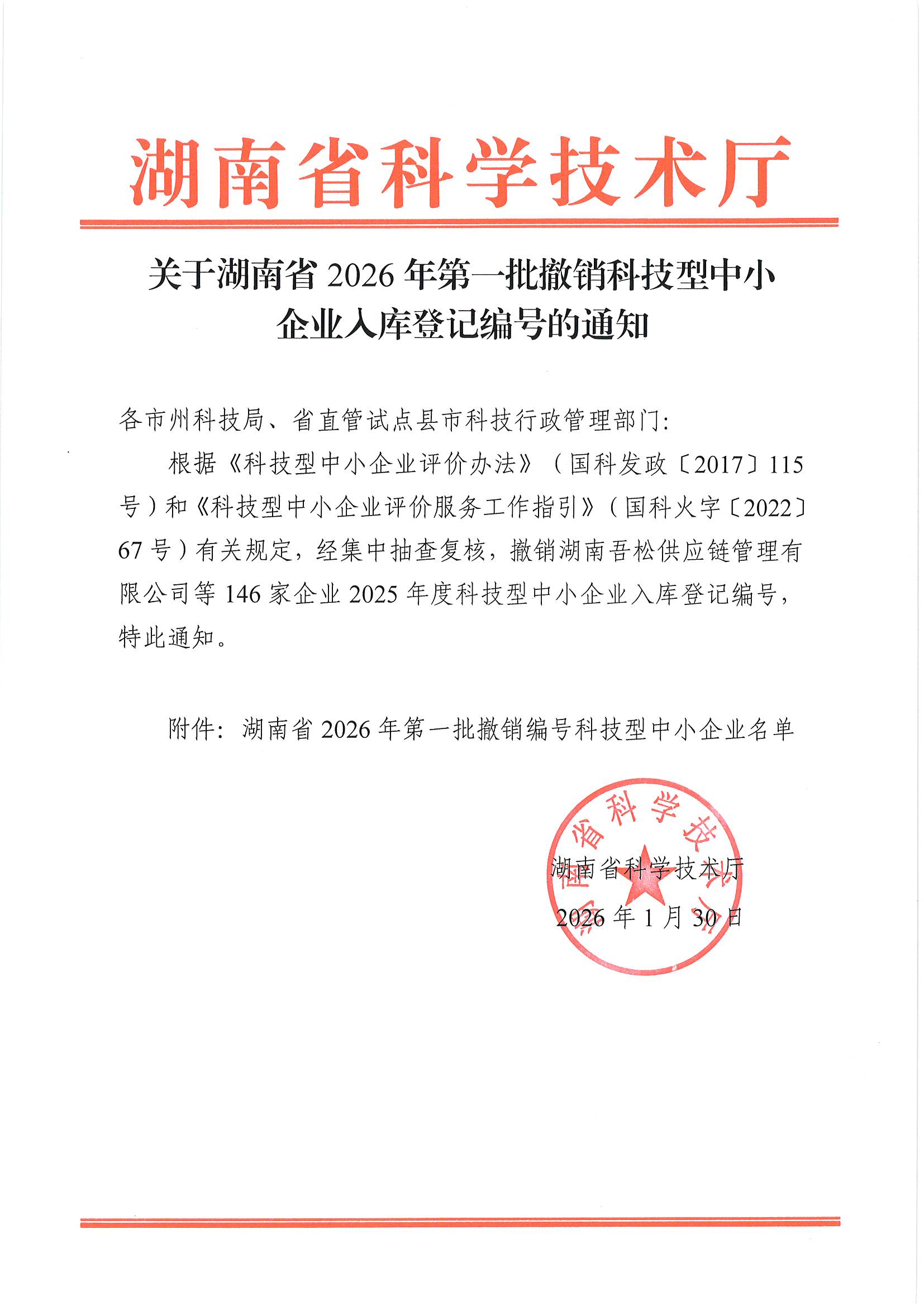 关于湖南省2026年第一批撤销科技型中小企业入库登记编号的通知.jpg PICTURE