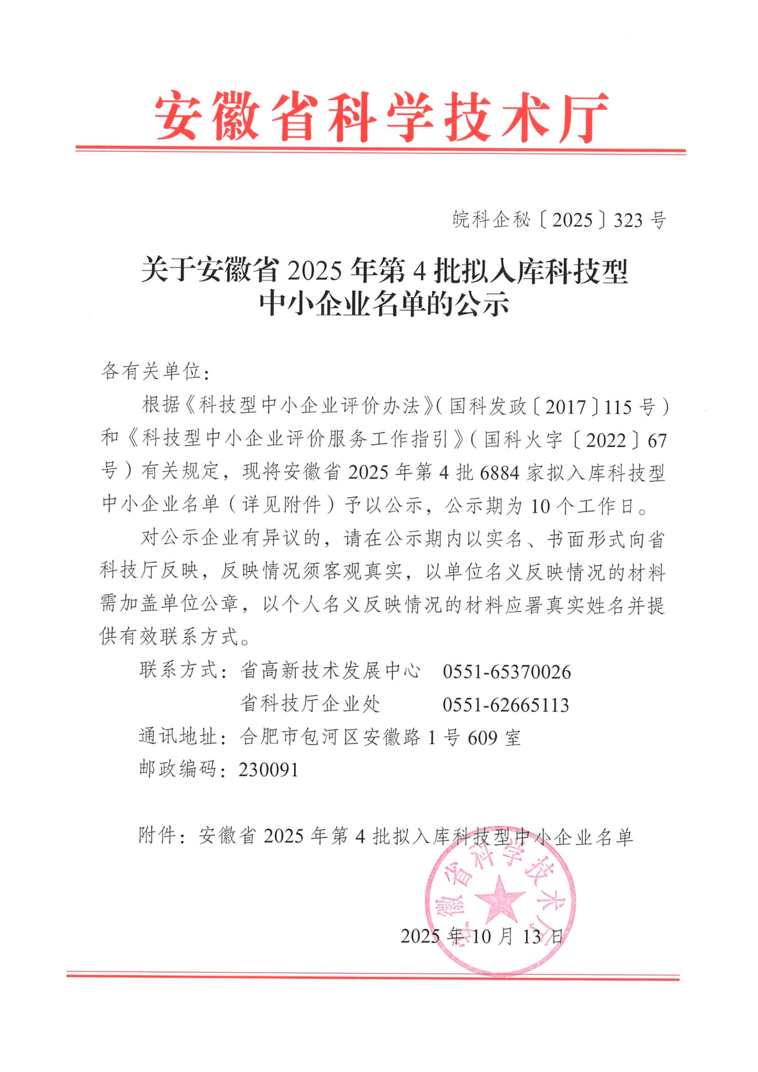 安徽省2025年第4批拟入库科技型中小企业名单公示正文.jpg PICTURE