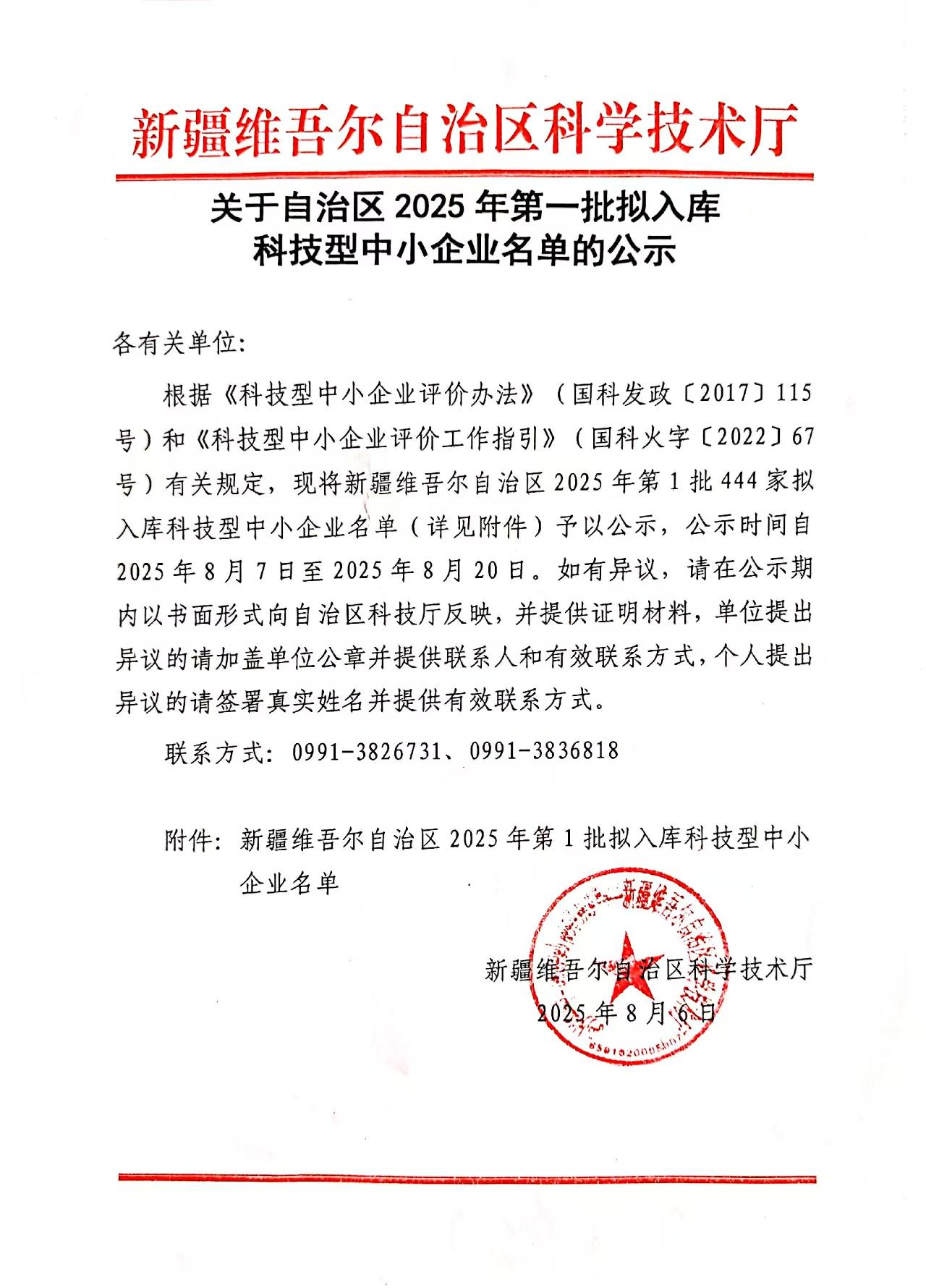 新疆维吾尔自治区2025年第1批拟入库科技型中小企业名单公示正文.jpg PICTURE