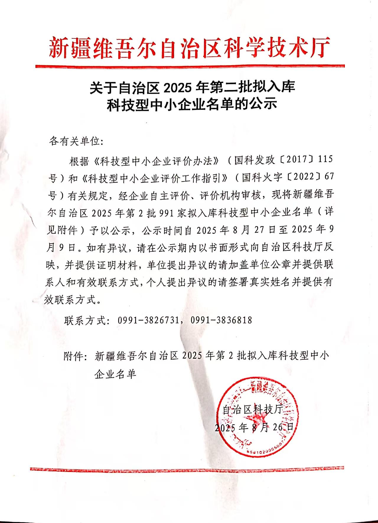 新疆维吾尔自治区2025年第2批拟入库科技型中小企业名单公示正文.jpg PICTURE