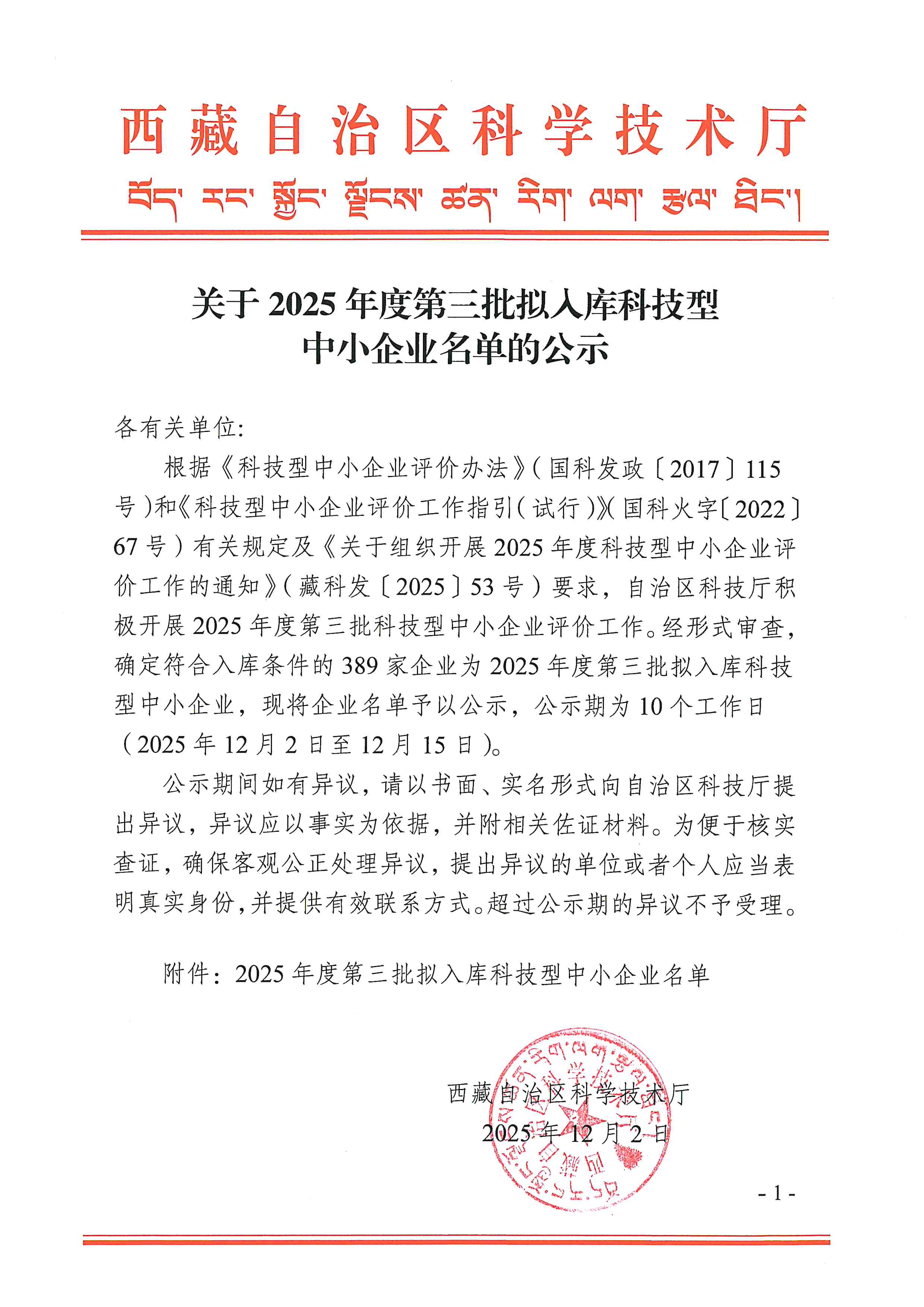 西藏自治区2025年第3批拟入库科技型中小企业名单公示正文.jpg PICTURE